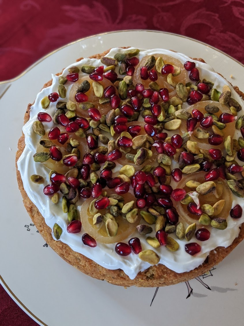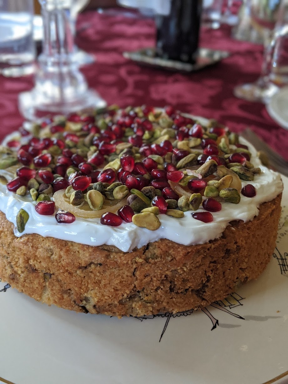 Bärenjäger is a German honey liquor, and though the recipe only calls for a very small amount, the honey flavor permeates the entire cake. I also added pistachios in the cake and on top because when I think of Middle Eastern food, I immediately think of pistachios and pomegranate seeds (which I also sprinkled on top). Also, I could easily eat an entire bag of pistachios without thinking.