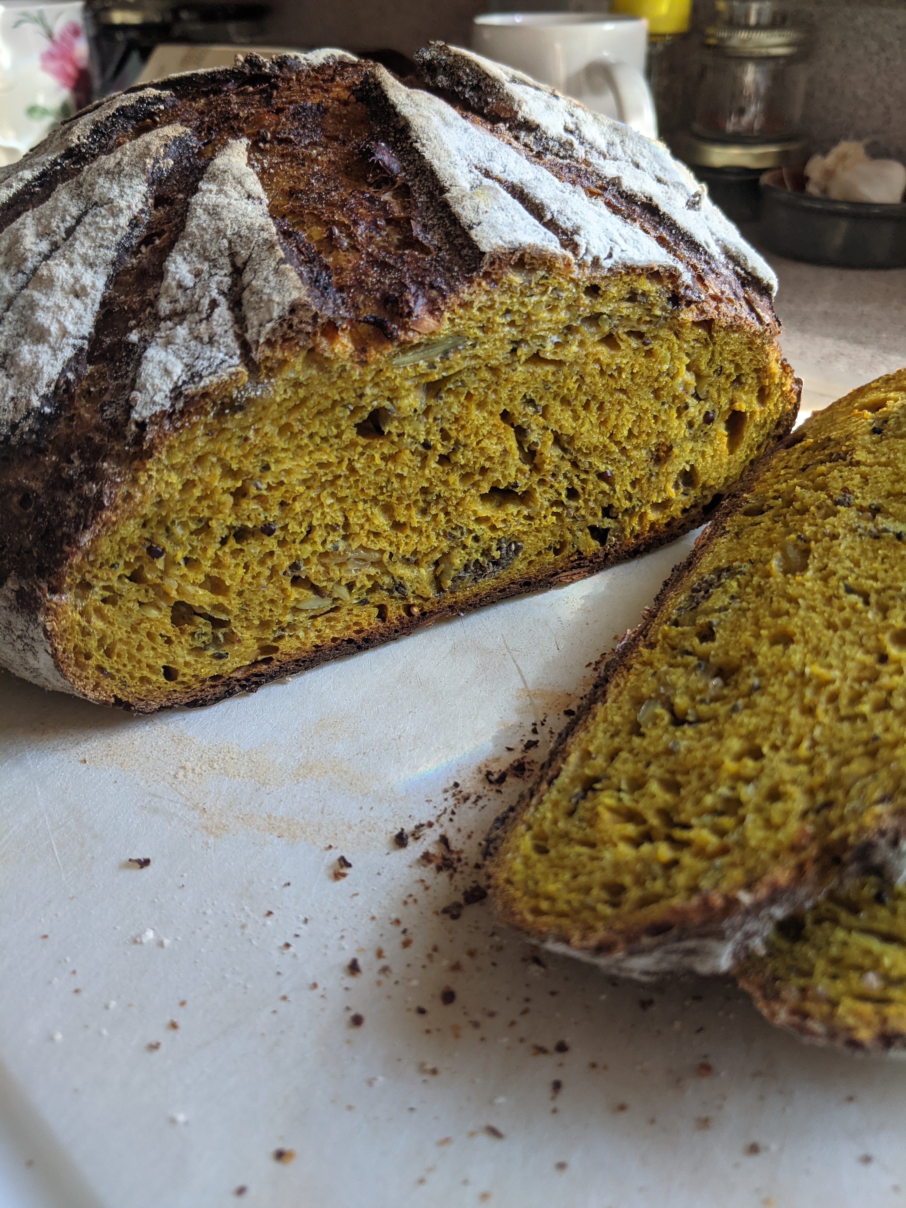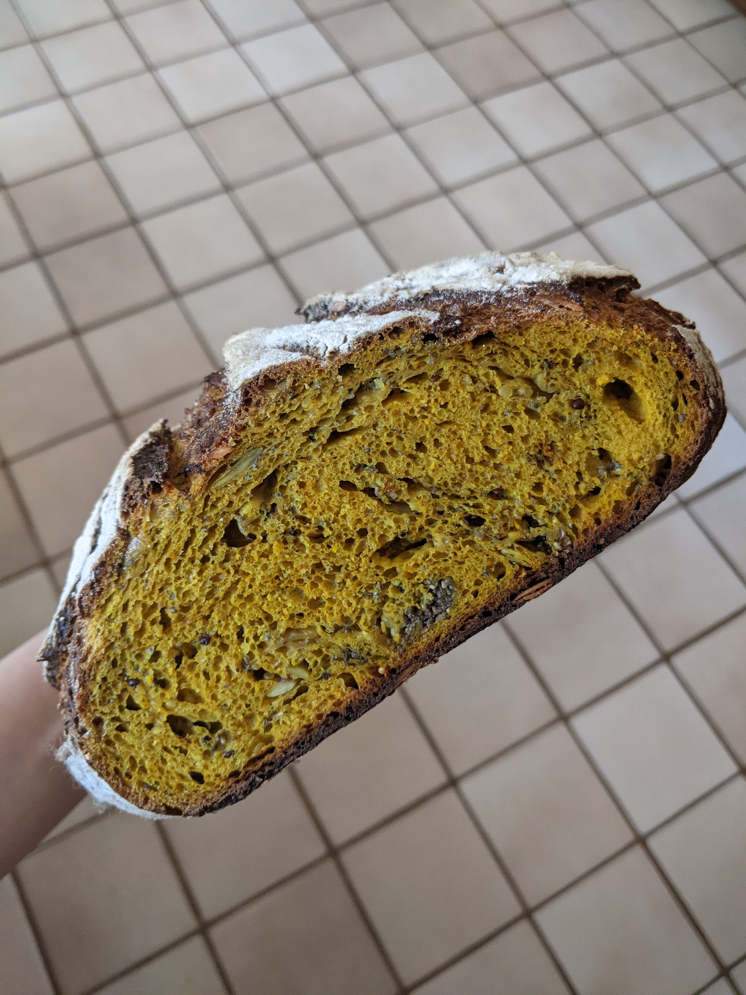 I based this recipe off of my favorite sourdough recipe from Vanilla and Bean. It is far simpler than many recipes I have seen and turns out perfectly every time. However, I have been experimenting with how far I can push the ratios of various flours, adding less white flour and more whole wheat and rye flour, without destroying the structure of the loaf, and it turns out, I could go pretty far. These experiments have been partially to get more fiber into my diet, but mostly to earn my health-food-loving mother’s approval. In fact, her nearly pathological need to put turmeric in every dish she ever made for me growing up inspired this most recent loaf.Â