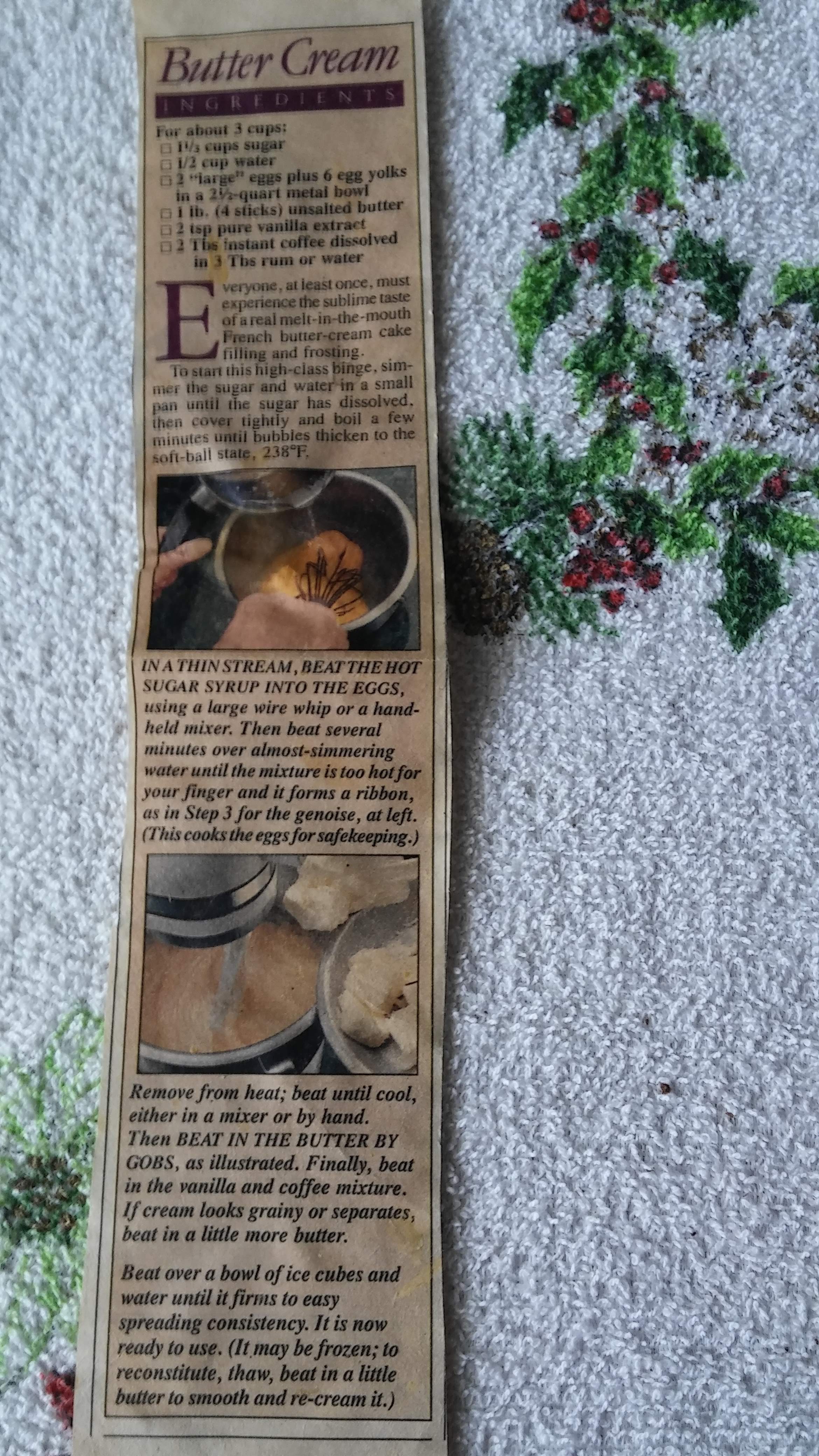 As I got older and began baking for myself, I asked my grandmother about it. She and my mother, who had made it once and swore never to do so again, said that it was the hardest frosting to make and it nearly always split or went horribly wrong. To protect my own sanity, I therefore chose not to bother trying to make it for many years. However, this year, I really wanted that frosting. I was feeling confident, so I called my grandmother and she sent me a photo of the recipe that she had cut out of the newspaper many years ago: