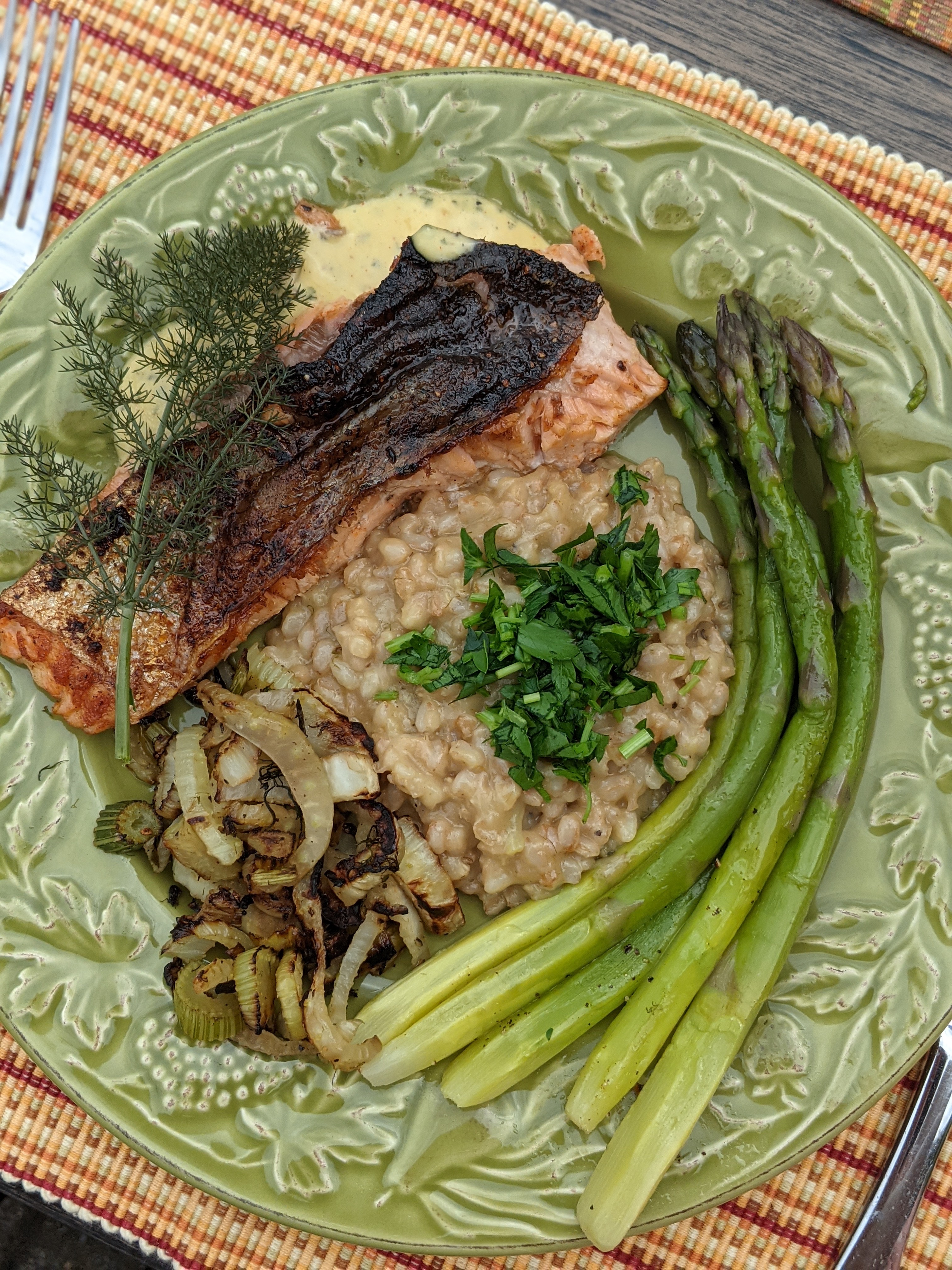 Pan seared salmon with lemon and tarragon aioli, fennel, farro risotto, and asparagus